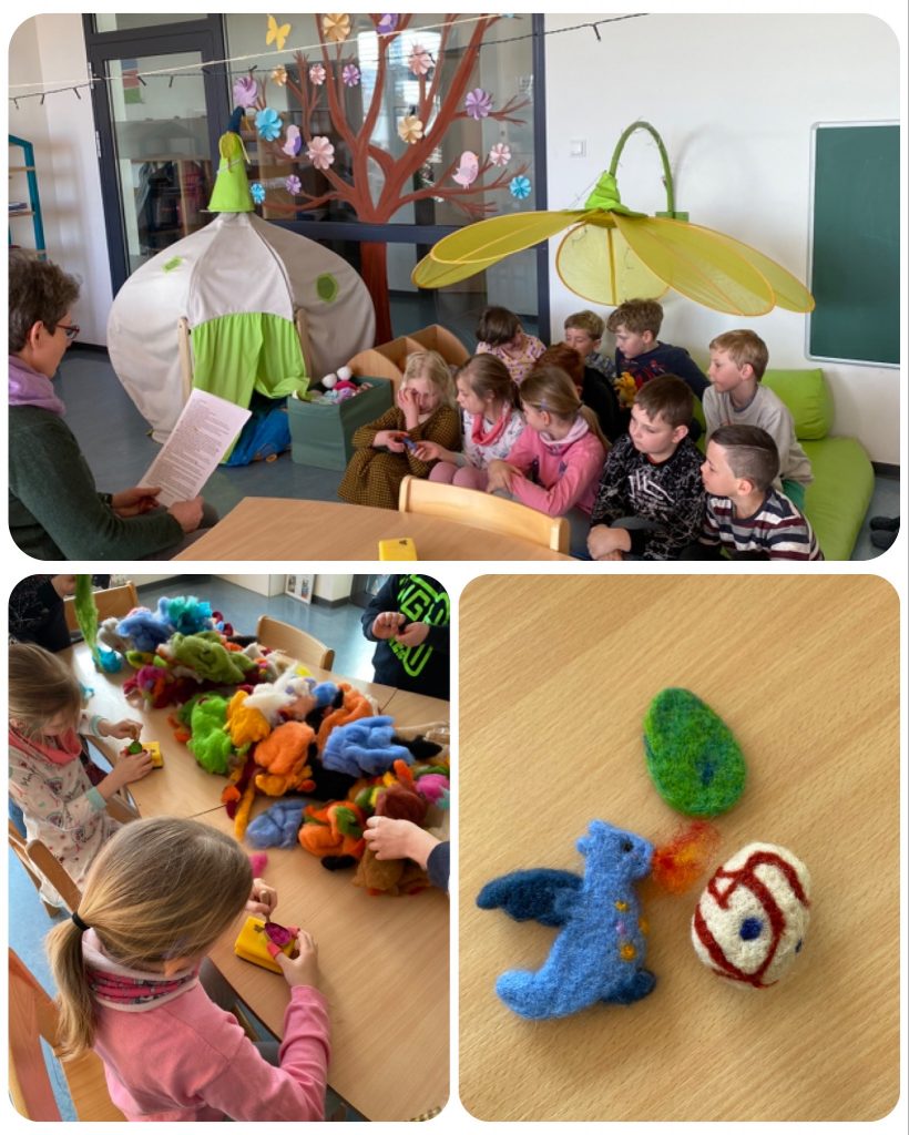Am Montag startete die Woche mit Frau Schiffer. Nachdem sie euch eine spannende Geschichte vorgelesen hat, habt ihr gemeinsam mit ihr dazu einen Dino oder bunte Eier gefilzt.