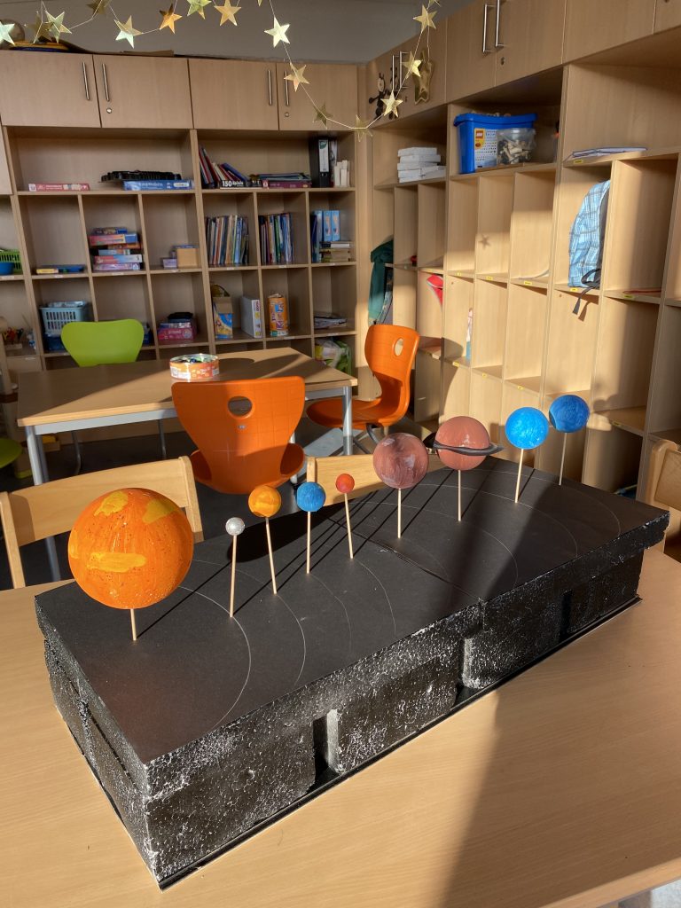 mit unserem Praktikanten Herrn Giebel habt ihr eine faszinierende Reise zu den Sternen gemacht. Ihr habt Wissenswertes über unser Weltall erfahren und habt gemeinsam mit ihm unser Sonnensystem nachgebaut.