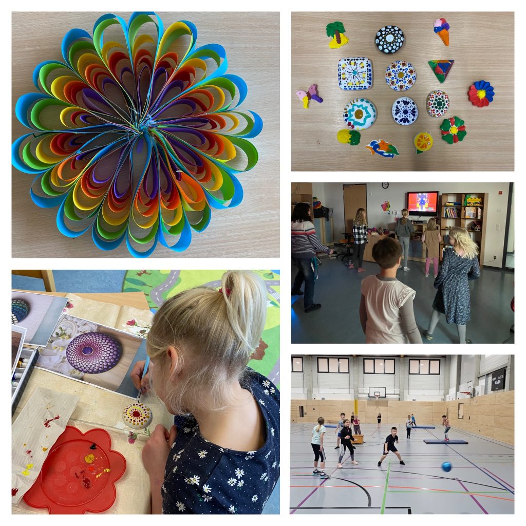 wir blicken auf eine tolle, entspannte Ferienwoche zurück. Trotz des schlechten Wetters haben wir uns ein paar schöne Tage gemacht. Gemeinsam waren wir wieder kreativ und haben in Regenbogenfarben Blumen für unsere Fenster gebastelt. Vorher aus Gips gegossene Steine habt ihr anschließend individuell bemalt. Aber auch sportlich seid ihr aktiv gewesen und habt in der neuen Turnhalle Sportspiele gemacht und Zumba getanzt.