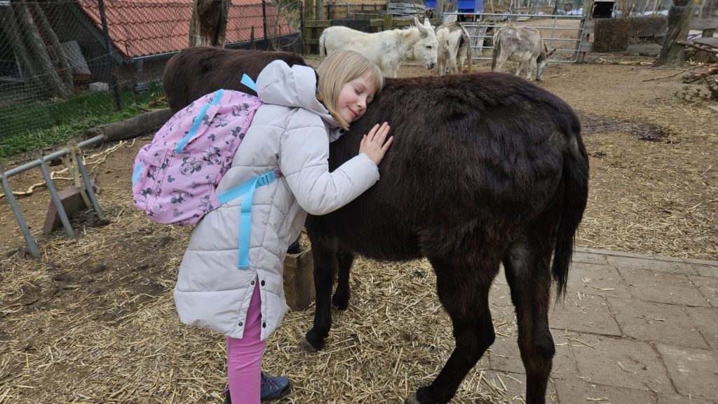 Mit einem Transporter wurden wir nach Schulschluss zur Eselfarm nach Derenburg gebracht. Dort angekommen, begrüßten uns 11 Esel zwischen 6-27 Jahren. Wir erfuhren von unserer Begleiterin, welche sich ehrenamtlich um die Esel kümmert, dass Esel 35-40 Jahre alt werden können. Die jüngste Eselstute auf der Eselfarm ist die 6-jährige Lola und der älteste Bewohner ist Finn, der schon 27 Jahre „auf dem Buckel“ hat.