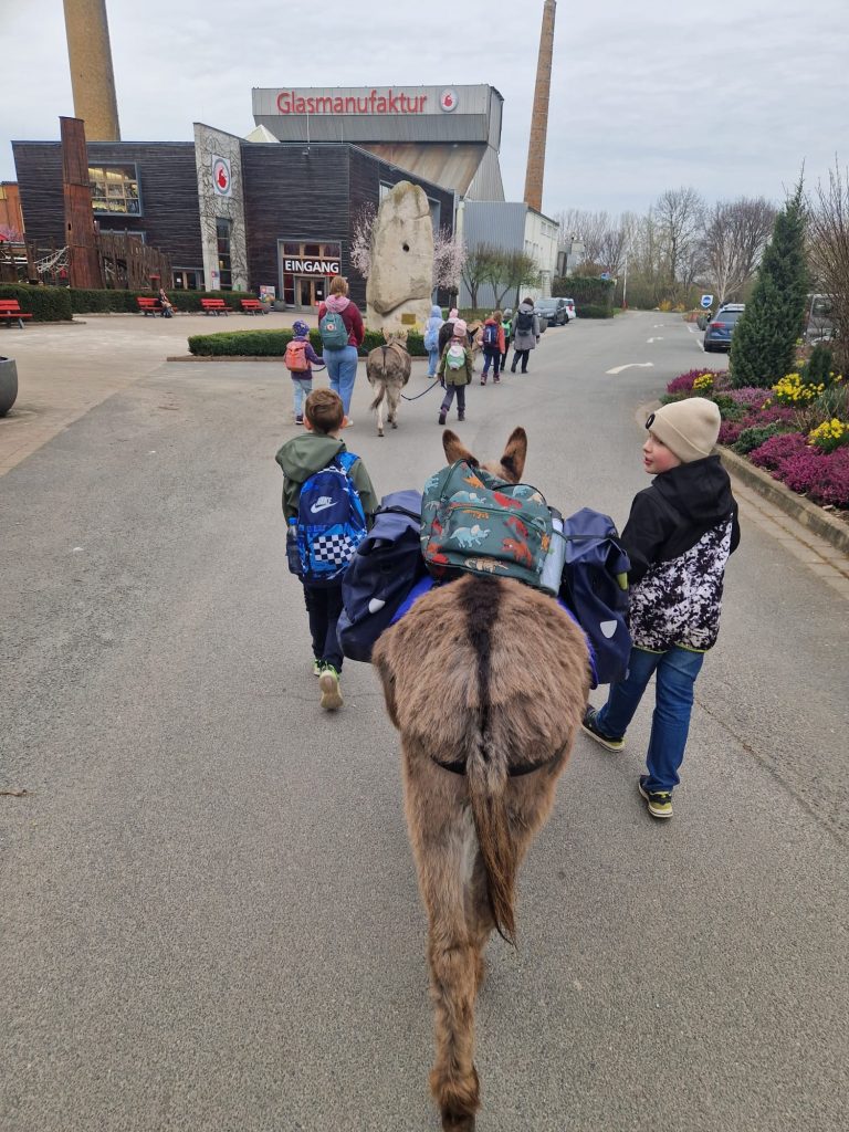Außerdem sollten wir darauf achten, dass sie unterwegs nicht vom Weg abkommen und kein Gras fressen! Tja, wir waren stets bemüht. Manchmal versuchte uns doch der eine oder andere Esel auszutricksen. Dennoch reihten sich die Esel immer wieder ein und hörten auf das Kommando „komm“. Als wir unser Ziel Glasmanufaktur erreicht hatten, brauchte jeder, egal, ob Mensch oder Tier eine kleine Siesta.